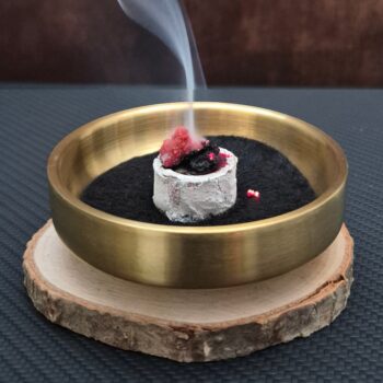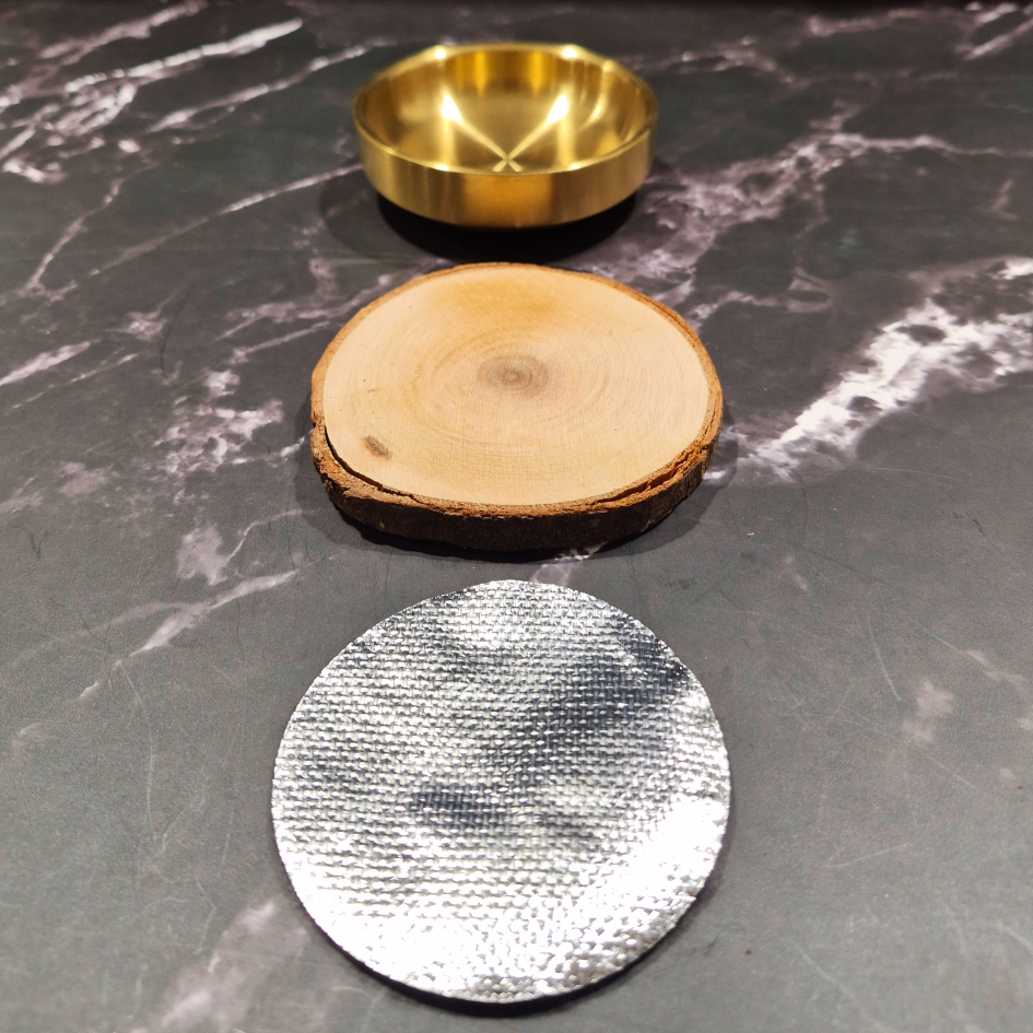 Το σετ θυμιατηρίου περιλαμβάνει ένα διπλής στρώσης, επιχρυσωμένο θυμιαματό από ανοξείδωτο ατσάλι, ένα δίσκο από φυσικό ξύλο για βάση και ένα θερμοανθεκτικό υπόστρωμα.